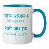 Met de tekst van het Yiddische spreekwoord ‘A Mensch tracht und Gott lacht’ in Hebreeuws en Engels (betekent een mens maakt plannen en God lacht).