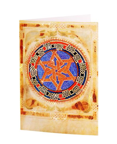 Art nr. 21145Mooie kaart met goudopdruk van een davidster die uit ineensluitende verbindingen bestaat. De illustratie is uit een oud manuscript uit de Bodleian Library in Oxford. Lees meer