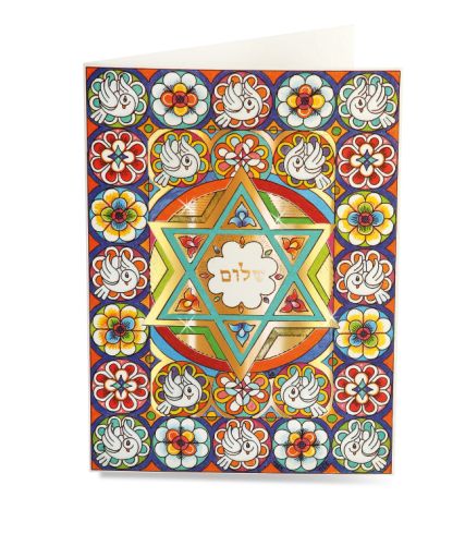 Dubbele kaart met envelop van de in Jeruzalem woonachtige artieste Gitta Bechshoft. Zij heeft deze kaart ontworpen op basis van middeleeuwse illustraties van Joodse manuscripten. De binnenkant van de kaart is tekstloos.