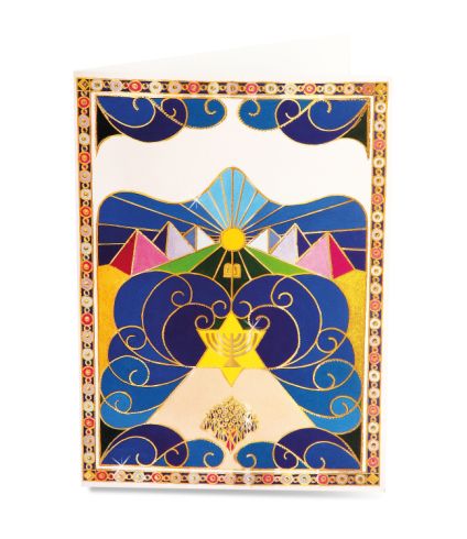 Prachtige kaart met goudopdruk van Sabine Saad. Een artistieke impressie van de reis naar het beloofde land van het volk Israel, de doortocht door de Rode Zee en het ontvangen van de wet. De kaart is aan de binnenkant zonder tekst. Wordt geleverd met envelop.