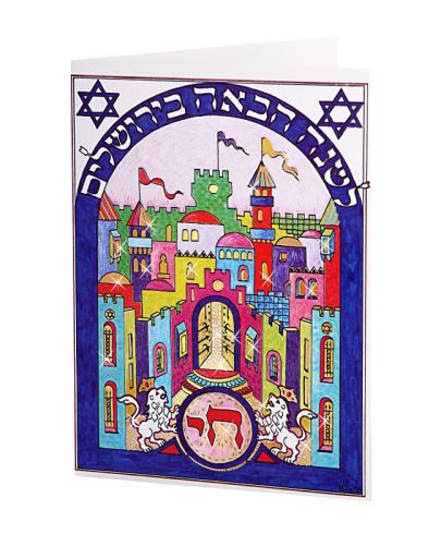 Dubbele kaart met envelop van de in Jeruzalem woonachtige artieste Gitta Bechshoft. De voorstelling is van Jeruzalem met twee leeuwen die links en rechts van het woord 'chai' staan. (chai betekent leven) De tekst in de boog boven de stad luidt: Lasjana haba'a biJeroesjalajim: volgend jaar in Jeruzalem. De binnenkant van de kaart is tekstloos.