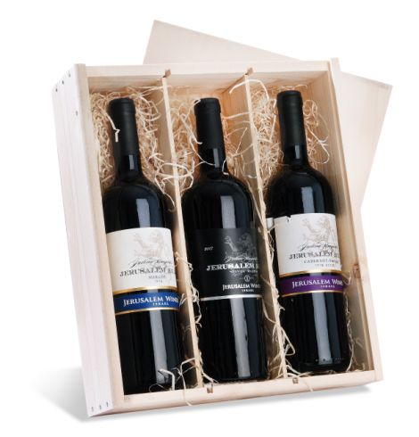 Drie prachtige wijnen uit de wijngaarden rond Jerusalem in een luxe houten geschenkkist. De kist bevat een stevige, kruidige Cabernet-Shiraz, een op hout gerijpte Silver Blend en een mooie, volle Merlot.