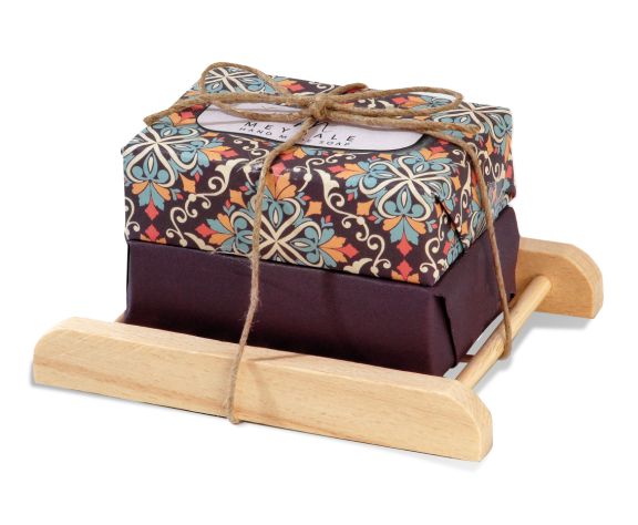 Art nr. 73375Twee stukken handgemaakte zeep op een houten zeeprekje. Mooi, aantrekkelijk verpakt, om zo cadeau te geven. Alle zepen hebben dezelfde frisse lentegeur. Lees meer