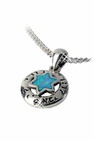 Een zilveren hanger davidster in semi-opaal. Met Hebreeuwse tekst uit Hooglied 6:3 'Ik ben van mijn geliefde en mijn geliefde is van mij'.