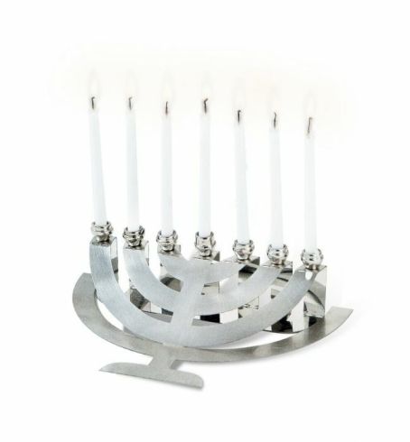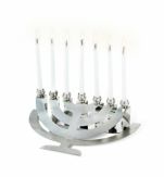 Art nr. 94161Menora roestvrijstaal Formaat: 5 cm hoog Prachtig vormgegeven menora van roestvrijstaal. Een kunstwerk van Yaela Shalev uit Timorim, een Moshav ten zuidoosten van Ashdod. Lees meer