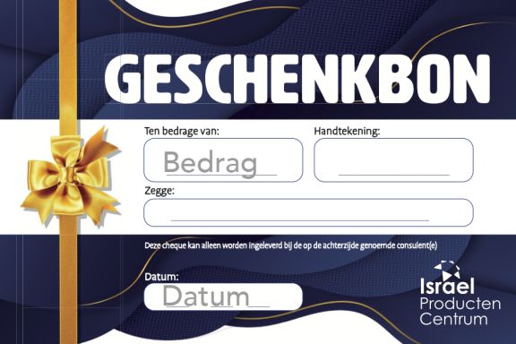 Deze cadeaubon is een leuk geschenk voor bijvoorbeeld een verjaardag, een bruiloft of een jubileum. De gelukkige kan met deze bon zelf een mooi cadeau uitzoeken via onze website www.israelwinkel.nl. Onze medewerkers geven u een unieke kortingscode, die door de ontvanger van de bon kan worden ingevuld bij het afrekenen op onze website. Deze bon is in verschillende bedragen te bestellen en kan niet in delen worden gebruikt.