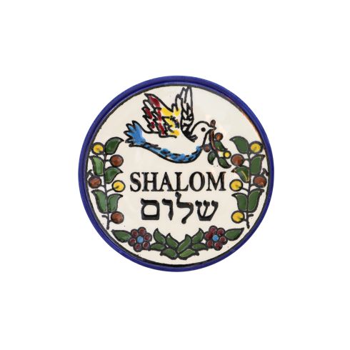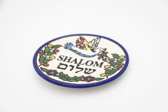 Art nr. 67465Armeens aardewerkHandgemaakt en -beschilderd in Jeruzalem. Vaatwasser- en magnetronbestendig.Er zit een gaatje in de achterkant waarmee de hanger aan de wand kan worden bevestigd. Onderzetter/Wandhanger Design: Shalom, met duifje. Lees meer