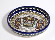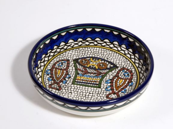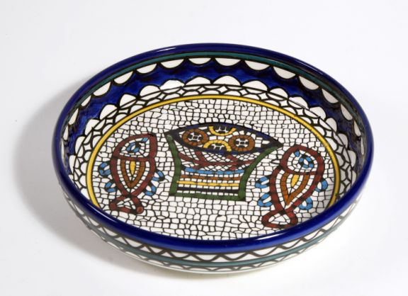 Art nr. 67441Armeens aardewerkHandgemaakt en -beschilderd in Jeruzalem. Vaatwasser- en magnetronbestendig.Grote schaalDesign: Mozaïek Broden en vissen, naar een mozaïek dat bij het Meer van Galilea gevonden is. Ook wel Tabgha genoemd. Lees meer