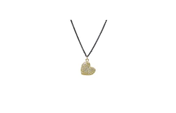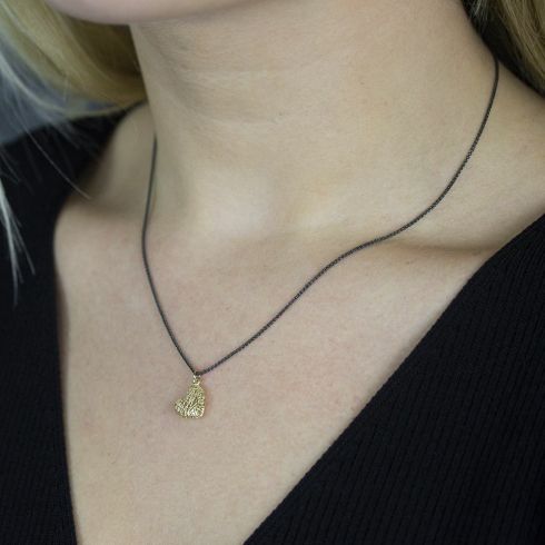 Het sieraad is tegelijkertijd lief en stoer. De sterling zilveren ketting is geoxideerd en heeft daardoor een krachtige zwarte look, het goud is daarentegen heel subtiel. Dit zorgt voor een sieraad met een prachtig balans! Dit collier is geproduceerd in Kiryat Gat in Israël.